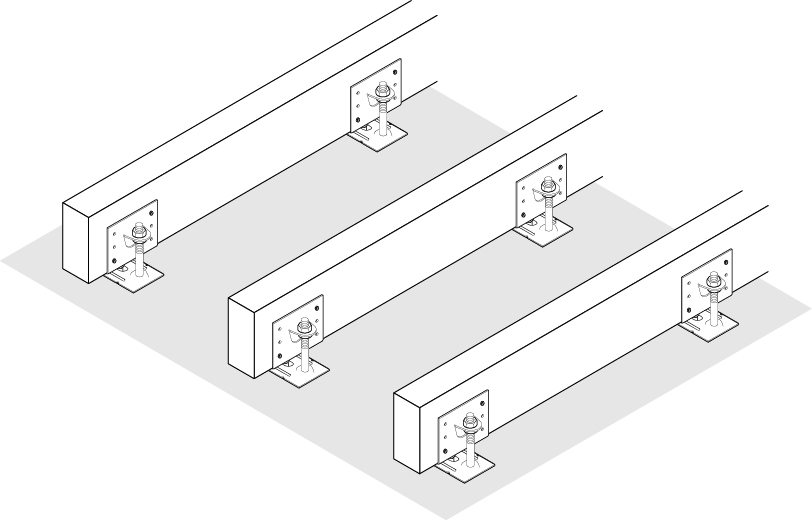 Attach joist support onto hex bolts and adjust to approx height required. Semi-tighten nuts - this will tighten the whole structure enough to withstand joists being inserted and secured