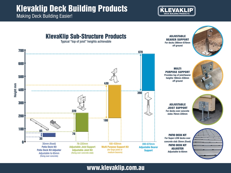 Check out our product graph below for which product to use depending on your height situation. KlevaKlip can solve your problem from 35mm to 670mm "top of joist" and has a range of low to the ground deck building products making it faster, easier and less hassles to build your deck.